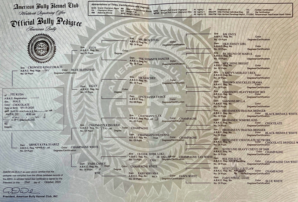 Be assured that you are getting an authentic breed of dog. All puppies come with proof of certification under ABKC for the authenticity of the breed. You know exactly what breed of dog you are getting and will officially be a part of a great community of dog lovers.
